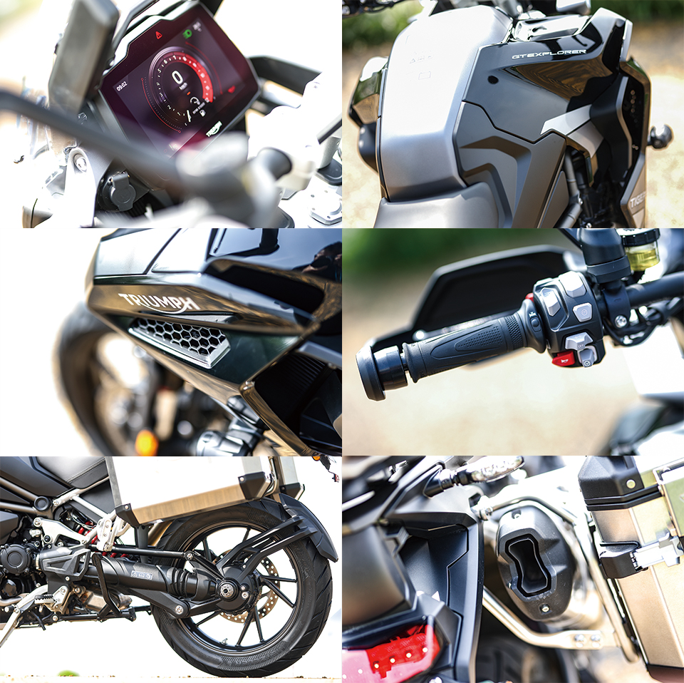 これみよがしな豪華さをひけらかすわけでも、使い切れないほどの機能が満載されているわけでもなく、すべてが手の内にあるところがいい。上位グレードのタイガー1200GTエクスプローラーには、容量30ℓの燃料タンクが備えられ、エンジンは頑強なプロテクションガードで覆われている。それはつまり、多くのビッグアドベンチャーと同質の威圧感を放つものだが、ひと度またがり、車体を起こせば、乗り手が感じていたプレッシャーはあっさりと雲散していく。