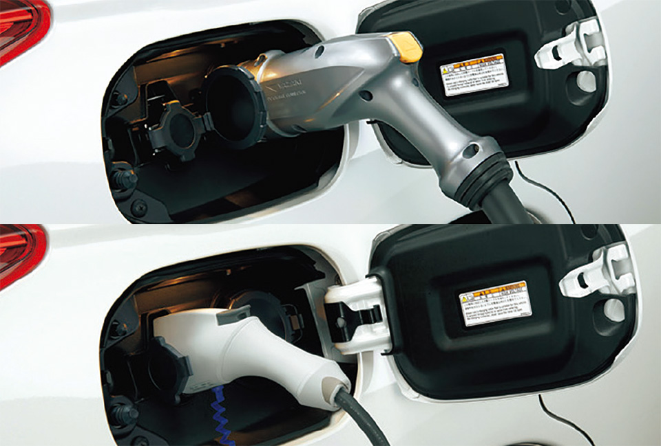 EV充電は、「普通充電」と「急速充電」の2種類がある。戸建住宅やマンション、ビルの契約駐車場は、主に「普通充電」を完備。単相交流100V、もしくは200Vが設置されている。一方、「急速充電」は、3相交流の200Vとなり、大幅に充電時間が短縮できる。現在販売されているEV車両は両方の差し込み口が装備され、差し込みプラグや充電口のソケット形状が異なるので間違えることはない。上写真が急速、下は普通充電用。