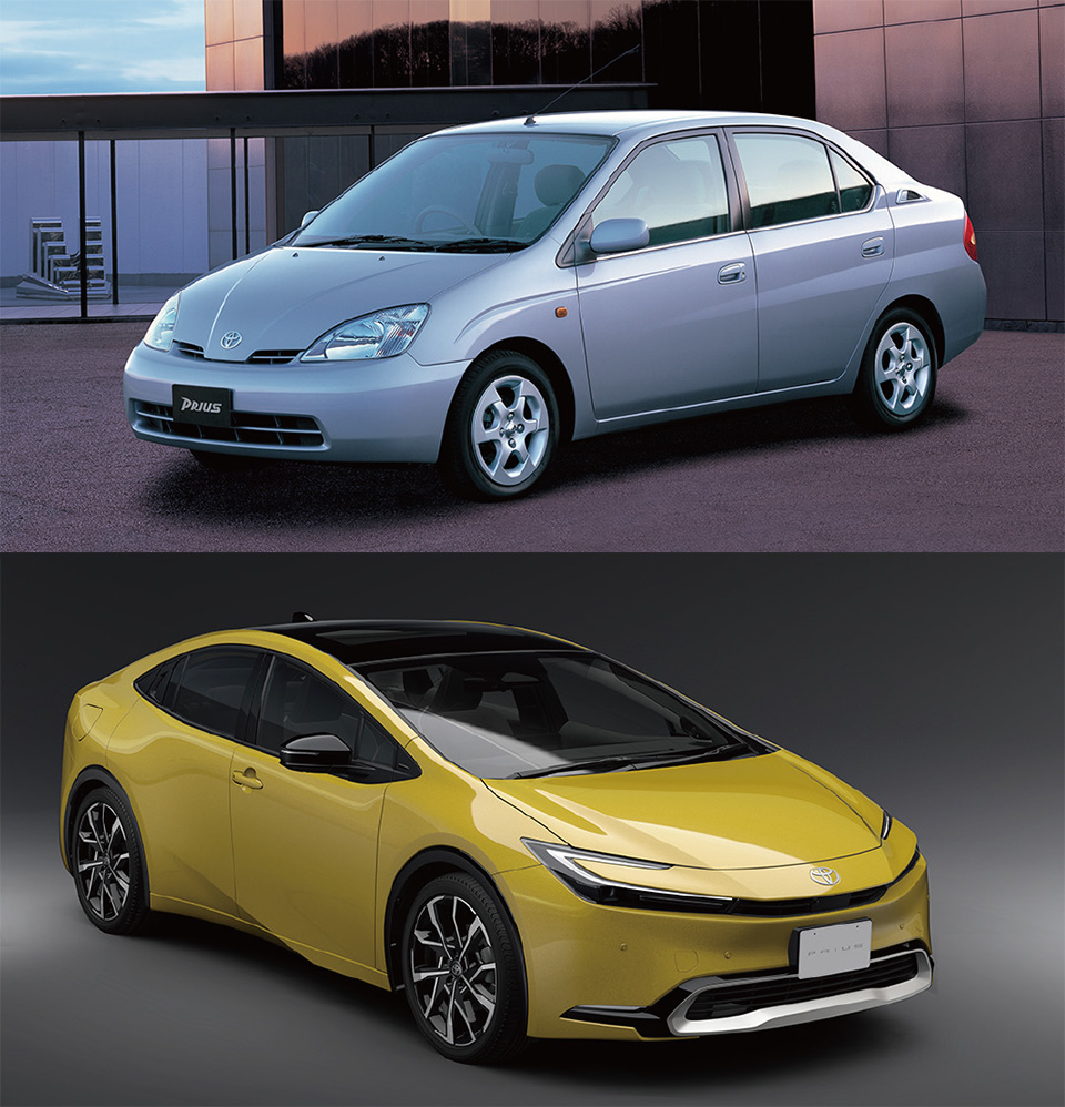 「21世紀に間にあいました」のキャッチフレーズで登場した初代プリウスから四半世紀。新型プリウスは“ハイブリッドの牽引役”をひとまず終えて、次の25年を目指して「Hybrid Reborn」をコンセプトに「一目惚れするデザイン」「虜にさせる走り」を開発目標とした。※初代(1997年・写真上) 新型(写真下)