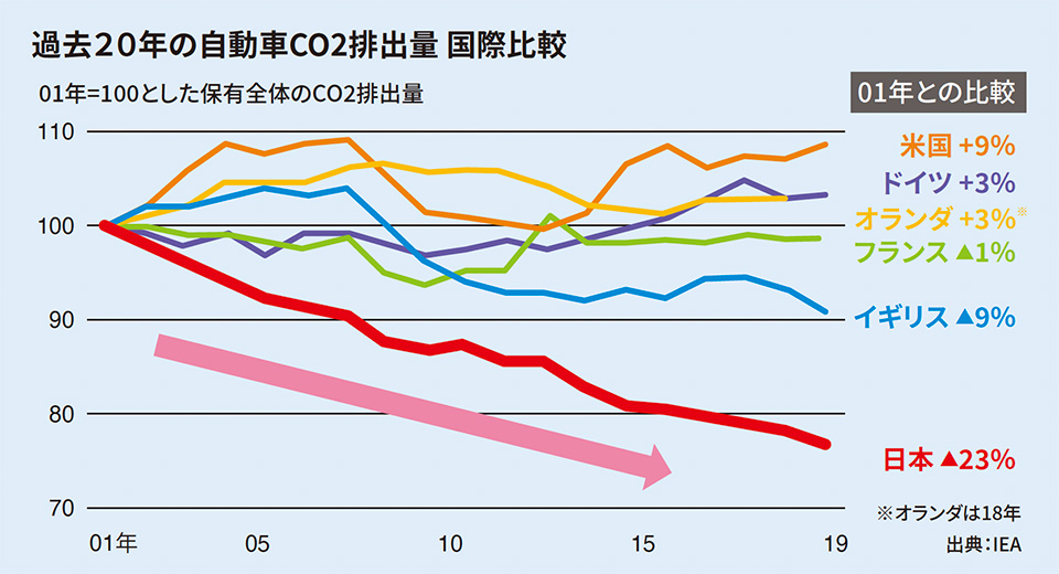 「一般社団法人 日本自動車工業会(JAMA)」が発表した資料によると、2001年から2019年までのCO2排出量削減は日本が圧倒的に優れていた。ハイブリッド車両や軽自動車の台頭が貢献したと考えられる。